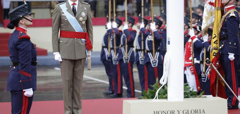 El rey Felipe, durante el homenaje a la bandera y a los que dieron su vida por España, momentos antes del desfile militar. EFE