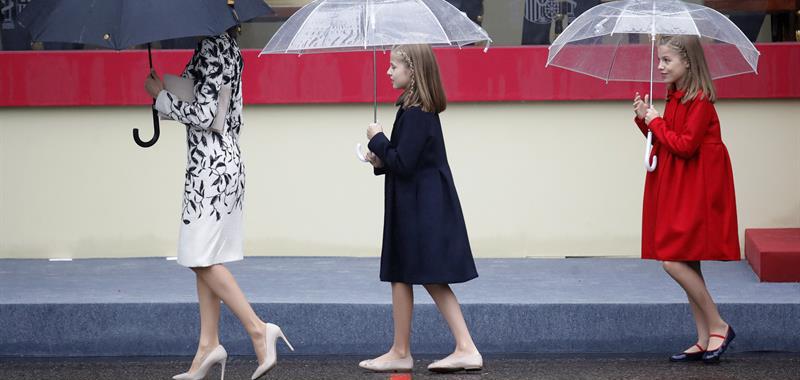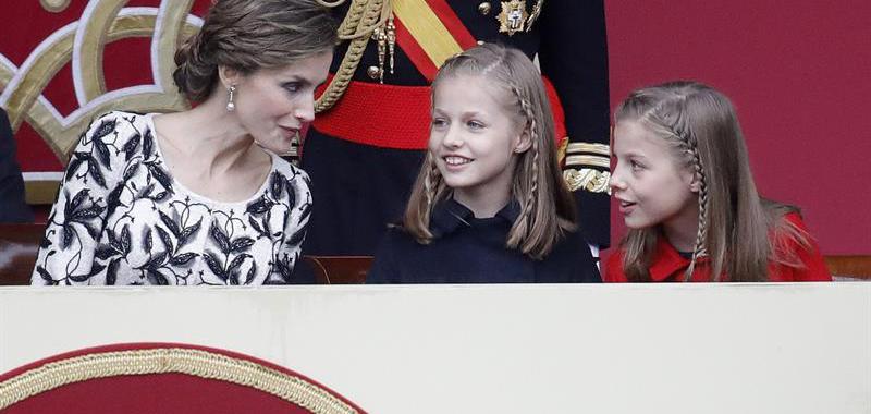 Doña Letizia, y sus hijas la princesa Leonor y la infanta Sofía, al término del desfile militar que han presidido los Reyes. EFE