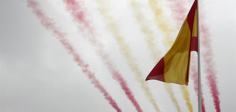 La patrulla Águila pinta en el cielo de Madrid la bandera de España. EFE