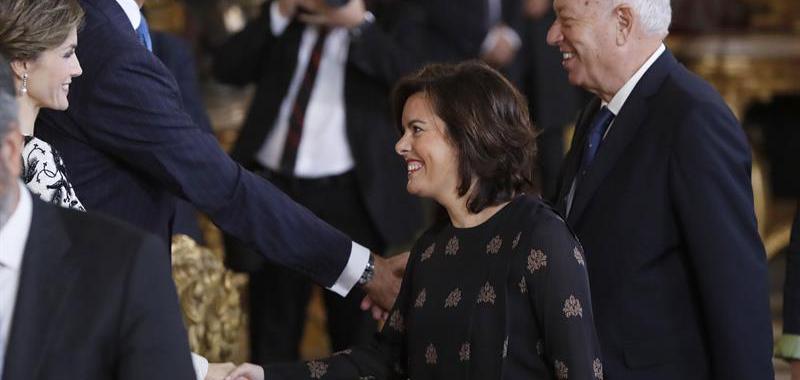 La vicepresidenta en funciones Soraya Sáenz de Santamaría y el ministro de Exteriores en funciones José Manuel García Margallo saludan a los Reyes. EFE