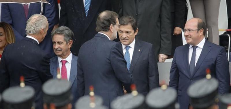 Javier Fernández y Mariano Rajoy se saludan en el palco de autoridades durante el desfile militar. EFE