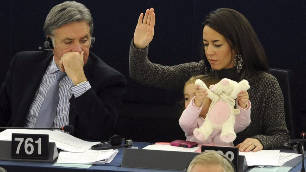 La eurodiputada italiana Licia Ronzulli en su escaño con su hija pequeña (Foto: Efe)