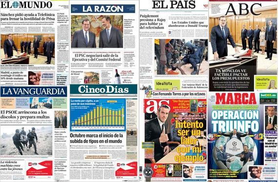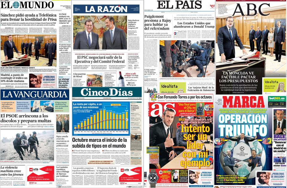 El Mundo sigue indagando en los pasos de Sánchez antes de su irremedibale dimisión y asegura en portada que el exsecretario socialista "pidió ayuda a Telefónica para frenar la hostilidad de Prisa". Según el diario "se reunió con el presidente de la compañía antes de lanzar el órdago al Comité Federal del PSOE" y "Álvarez-Pallete le contestó que no tenía nada contra él y que jamás se mete en política". Y en su partido se "multará con 600 euros a los 15 diputados que votaron 'no'", indica también El Mundo, que lleva a su portada la imagen de Mariano Rajoy jurando su cargo ante el Rey para señalar que ahora el ya presidente "medita el gabinete". Mientras, "Madrid, a punto de restringir el tráfico un 50%", y en las páginas de internacional, "el ejército iraquí se prepara para tomar Mosul calle a calle".