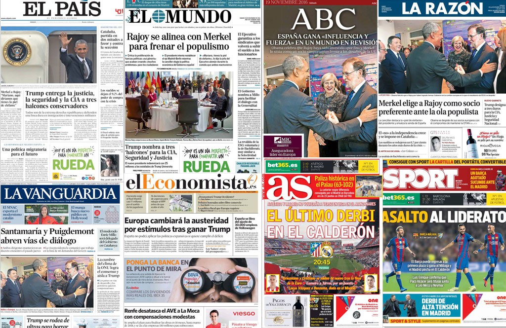 Obama se despide de Europa y el mundo espera a Trump. Aunque si hay un protagonista en la prensa de este sábado, es Rajoy, que, entre palabras de alivio, ya ha sido felicitado en persona por Merkel y el mandatario estadounidense.