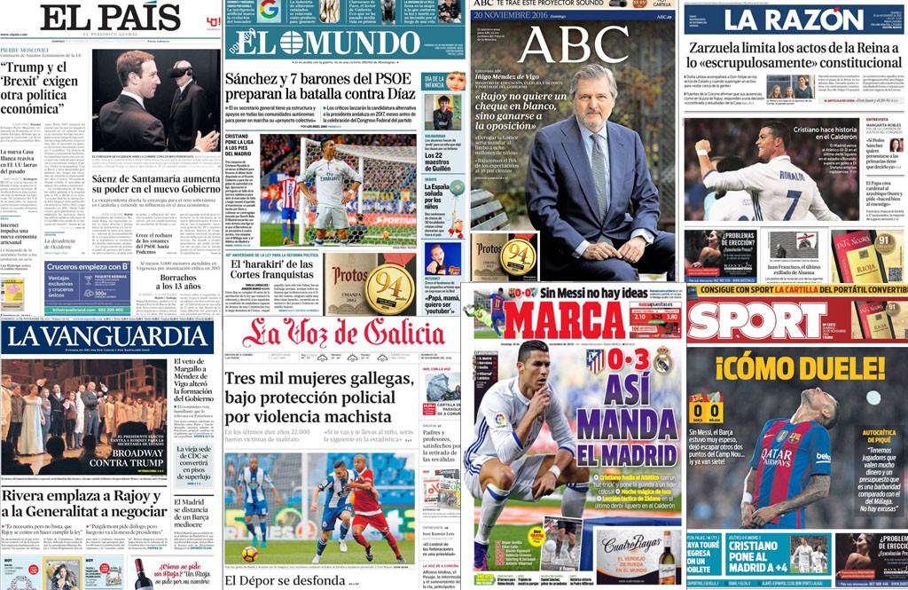 La prensa de este domingo va de nombres propios: Donald Trump, Íñigo Méndez de Vigo... pero, sobre todo, Pedro Sánchez y Cristiano Ronaldo, de resaca tras el derbi madrileño. Todo ello sin olvidar a la Reina.