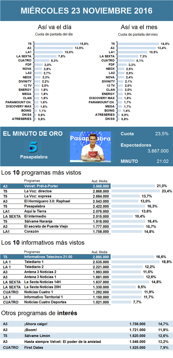 La serie de Antena 3 sigue siendo la reina de los miércoles, y en esta ocasión obtuvo un seguimiento por encima de los tres millones y medio de espectadores y el 21% de la audiencia. Frente a la serie de ficción, el concurso de talento musical La Voz mejoró con respecto a otras ediciones y se consolida como la gran alternativa. Raphael estuvo como invitado a El Hormiguero, que hizo más de dos millones y medio de espectadores de media. El pico de audiencia de las 21 horas se dejó notar en la recta final de Pasapalabra, con 3.887.000 espectadores que sintonizaron el programa de Telecinco a las 21.02.
