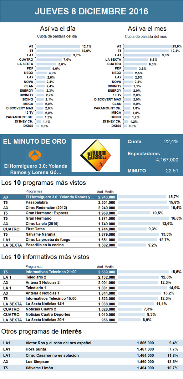 Este jueves El Hormiguero 3.0, de Antena 3, volvió a acaparar el completo liderazgo del día tras haberlo recuperado la semana pasada. Así, se mantuvo como minuto de oro y repitió como lo más visto de la jornada gracias, en esta ocasión, a la visita de Yolanda Ramos y Lorena Gómez, participantes en la presente edición del programa Tu cara me suena de la cadena. Durante el horario estelar, ascendió al primer puesto el cine de Antena 3, Redención (2012), con casi un millón más de interesados que la semana pasada. Pese a que Gran Hermano logró mantenerse como segunda opción, sufrió una considerable caída hasta su peor cifra histórica de espectadores y su cuota más baja de los últimos dos años debido a la película protagonizada por Jason Statham. Y es que la cinta se ensañó con sus rivales, haciendo perder fuerza también a Pesadilla en la cocina, de La Sexta, que descendió desde lo más alto de la lista con casi un millón menos de seguidores, quizás también debido a que se trataba de un programa repetido. Por detrás, logró mejorar levemente la serie de La 1, Víctor Ros, tras alcanzar hace una semana sus peores resultados de esta temporada. Este jueves, no corrió la misma suerte que la semana pasada el cine de La 2, por lo que no consiguió volver a imponerse a Cuatro. De este modo, y pese a apenas haber variado sus resultados, Mentes criminales: sin fronteras se impuso a la película El sueño del mono loco, que ni siquiera rozó la mitad de los excelentes datos alcanzados la semana anterior.