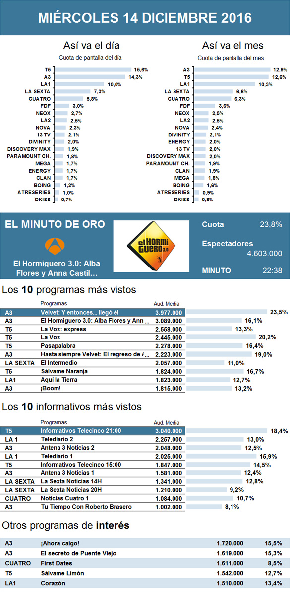 Un miércoles más, Antena 3 se alzó con el completo liderazgo del día. Su programa previo al horario estelar, El Hormiguero 3.0, nuevamente se coronó minuto de oro gracias, en esta ocasión, a la visita de las actrices Alba Flores y Anna Castillo, que presentaron el musical Drac Pack. Pese a los buenos datos obtenidos por el programa de Pablo Motos, lo más visto del día volvió a ser su espacio posterior, Velvet, que sigue imperando en lo más alto del podio a tan sólo un capítulo de su desenlace final. Se mantuvo como segunda opción de la noche La Voz, de Telecinco, que, pese a mejorar los resultados de su programa del miércoles pasado (semana festiva), continuó viendo caer sus cifras en relación con las de hace dos semanas. Por detrás repitió Comando actualidad, de La 1, sufriendo un descenso en cuanto a sus registros de la semana pasada pero mejorando respecto a la anterior. Muy de cerca le siguió la película de Cuatro, Los mercenarios 2, con una considerable mejoría en relación a sus resultados de semanas anteriores. Así, en esta ocasión logró imponerse a la cinta de La Sexta que, con Van Helsing, mantuvo sus cifras de la semana pasada, si bien mejoró los de hace dos. El cine de La 2 no varió mucho respecto a semanas anteriores con Habla, mudita.