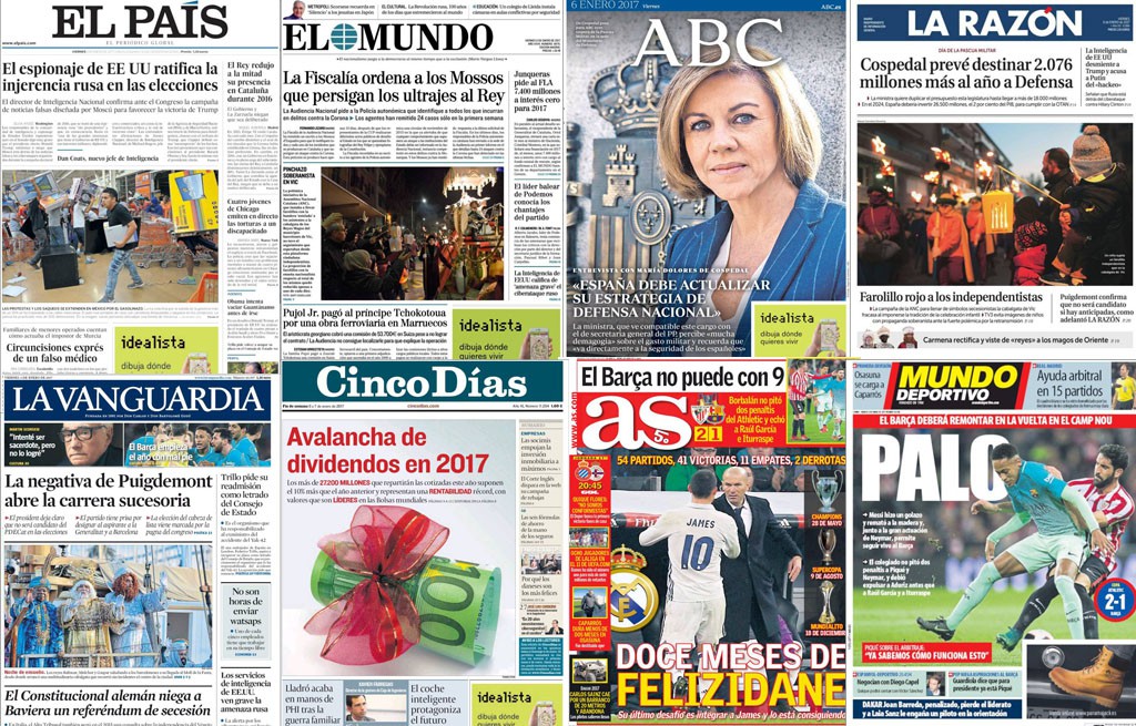 A ese asunto dedica su apertura El País: “El espionaje de EEUU ratifica la injerencia rusa en las elecciones”. La imagen llega del otro lado del Atlántico: “Las protestas y los saqueos se extienden por México por el gasolinazo”. Más temas: “El Rey redujo a la mitad su presencia en Cataluña durante 2016”; “Cuatro jóvenes de Chicago emiten en directo las torturas a un discapacitado”; “Obama intenta vaciar Guantánamo antes de irse”; “Trillo pide volver a ocupar su plaza en el Consejo de Estado”; y “Tareek El Aissami, nuevo vicepresidente, el chavista más rechazado”. Además: “Circuncisiones exprés de un falso médico”.