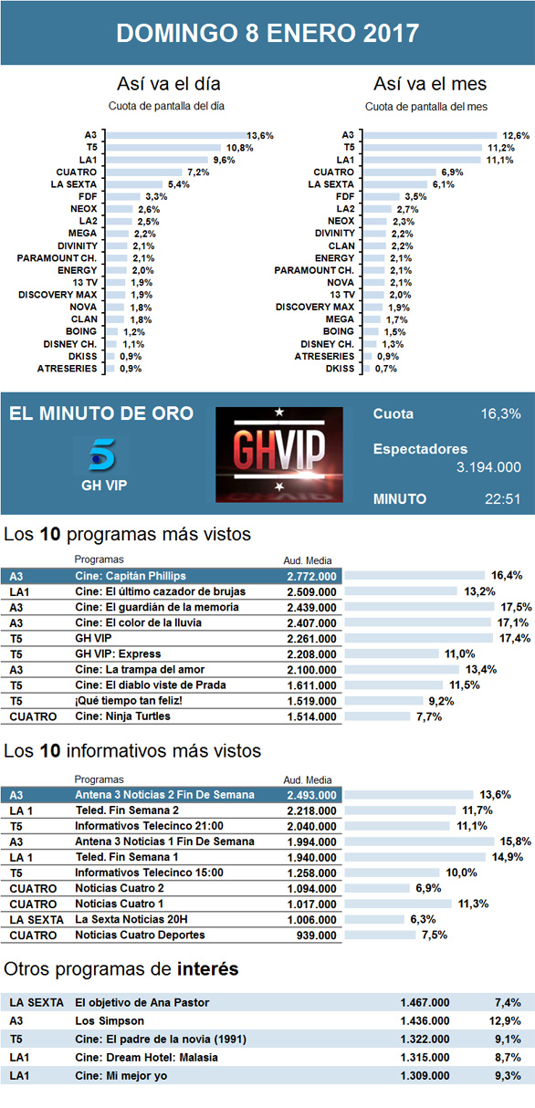 Este domingo, se coronó como minuto de oro el regreso a Telecinco de Gran Hermano VIP. Si bien, al contrario que durante el estreno de sus cuatro ediciones anteriores, no consiguió ser lo más visto del día, puesto que ocupó el cine de Antena 3 con el debut televisivo de Capitán Phillips. Pese a tan buenos resultados, la película perdió a medio millón de seguidores en relación con el especial Tu cara me suena: Concierto de Año Nuevo emitido hace una semana. Como segunda opción de la noche quedó la cinta elegida por La 1, El último cazador de brujas, que mejoró muy considerablemente los datos de la semana pasada. Así, ocupó el tercer lugar de la noche el 'reality' de famosos con casi un millón menos de seguidores que durante el debut de la edición anterior, siendo su peor arranque histórico. Por detrás le siguieron, bastante igualadas, Cuatro y La Sexta. Aunque ambas reunieron casi medio millón más de interesados, en esta ocasión, el cine de la cadena roja se impuso gracias a Ninja Turtles al programa del canal verde, El objetivo de Ana Pastor. Peor suerte corrió La 2, pues la cinta Loerak empeoró levemente sus datos anteriores, alejándose así del medio millón de espectadores. Cabe destacar los buenos resultados obtenidos poco antes del horario estelar por el partido de Liga Española, entre el Villarreal y el Barcelona, que fue emitido por la cadena de pago Movistar Partidazo y que reunió a 1,2 millones de aficionados.