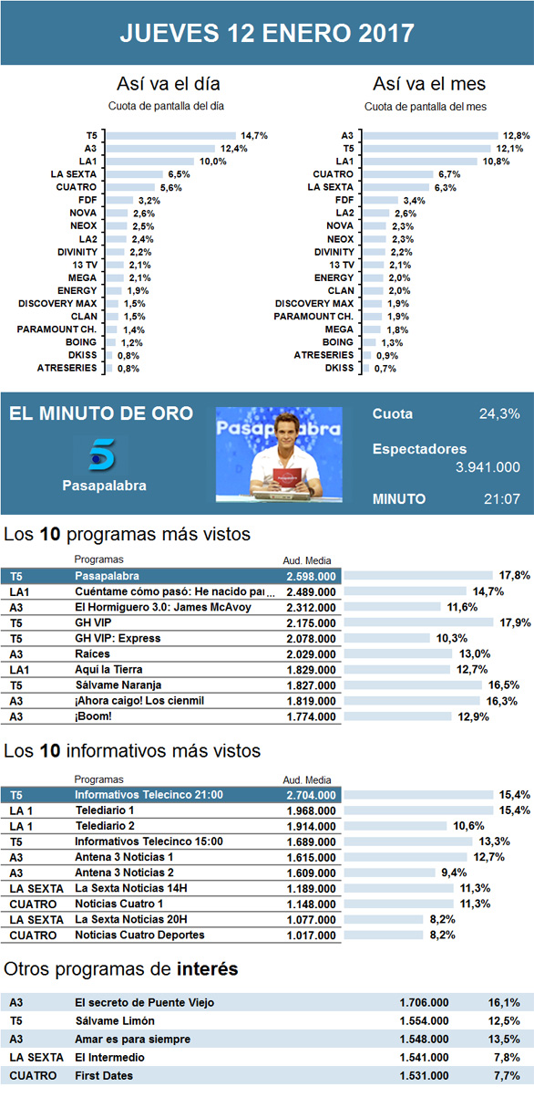 En esta ocasión, logró hacerse con el completo control del día Pasapalabra, de Telecinco. Tras algo más de un mes conquistando el minuto de oro de los jueves, esta vez se alzó también como lo más visto de la jornada. Durante el horario estelar, destacó La 1 con Cuéntame cómo pasó y el estreno de su decimoctava etapa que, además de convertirse en su peor arranque de temporada, reunió sus peores registros desde 2015. Se situó como segunda opción de la noche GH VIP, de Telecinco, que mejoró levemente los resultados de sus dos flojas galas anteriores. De este modo, le siguió muy de cerca el estreno de la miniserie Raíces en Antena 3, adaptación de la mítica serie de 1977, que atrajo a 2 millones de curiosos con el primero de sus cuatro capítulos. Por detrás quedaron, muy igualadas, La Sexta y Cuatro. Aunque con muy poca diferencia, en esta ocasión la cadena verde se impuso a la roja con una reposición de Pesadilla en la cocina frente a un nuevo episodio de Mentes criminales: sin fronteras, que apenas varió sus datos anteriores. El cine de La 2, con Barrios altos, también repitió sus cifras de hace una semana, que no rondan siquiera el medio millón de seguidores. Cabe destacar los excelentes resultados obtenidos por el partido de Copa del Rey en la cadena de pago Gol, pues logró imponerse a cualquier otro programa, tanto de pago como en abierto, gracias a sus cerca de 3,2 millones de interesados en el encuentro entre el Sevilla y el Real Madrid.
