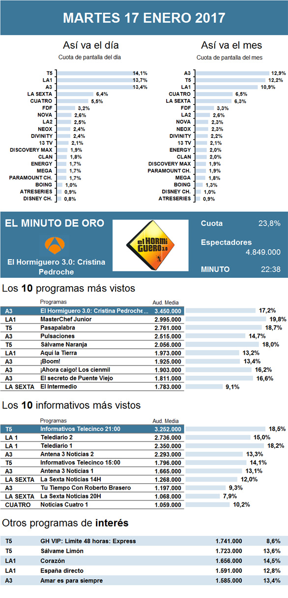 Por segundo martes consecutivo, logró mantener el completo liderazgo del día El Hormiguero 3.0, de Antena 3. Gracias a la visita de la presentadora Cristina Pedroche, el programa repitió como minuto de oro y como lo más visto de la jornada con casi medio millón más de interesados que la semana pasada, alcanzando su mejor dato de temporada. Sin embargo, en esta ocasión, la cadena no consiguió mantener el tirón durante el espacio posterior. Esto permitió que recuperase el primer puesto del horario estelar la final de MasterChef Junior, de La 1, con Paula como ganadora y con sus mejores registros de esta edición, pero su peor cierre histórico. Así, descendió al segundo puesto de la noche Pulsaciones, de Antena 3, con medio millón menos de interesados que durante su estreno hace una semana. Como tercera opción repitió GH VIP, de Telecinco, esta vez con su primer Límite 48 horas, que volvió a empeorar sus resultados en martes hasta alcanzar sus mínimos de temporada. Por detrás, Cuatro vio caer levemente En el punto de mira, que rondó así los 1,1 millones de interesados. De este modo, La Sexta recortó distancias gracias a la leve mejora de Tú sí que sí, el concurso de talentos presentado por Cristina Pedroche, pues se aproximó un poco más al millón de fieles. Aún mejor suerte corrió el cine de La 2 con ¡Aquí hay petróleo! y cerca de medio millón de espectadores. Durante la tarde, cabe destacar cómo mantuvo sus resultados Pasapalabra, de Telecinco, pese a entregar su primer bote del año a Carlos Adán, ya ganador en 2011 y concursante en programas especiales del concurso, que en esta ocasión se llevó un premio de 318.000 euros tras siete programas.