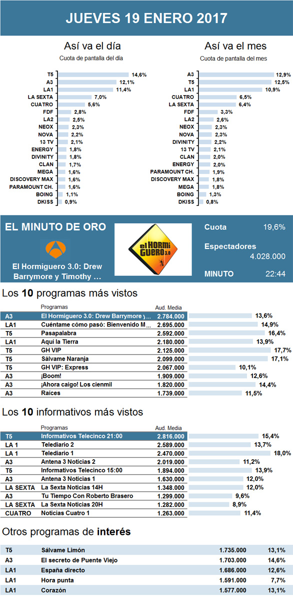 Este jueves, El Homiguero 3.0 arrebató el completo liderazgo del día a Pasapalabra. El programa de Antena 3, que contó con los actores hollywoodienses Drew Barrymore y Timothy Olyphant como invitados, logró conquistar en esta ocasión el minuto de oro y ser lo más visto la jornada gracias a medio millón de interesados más que la semana pasada. Durante el horario estelar, volvió a sobresalir La 1 con Cuéntame cómo pasó y una leve mejora en relación con los resultados obtenidos durante su estreno hace una semana. Con menos fortuna, repitió como segunda opción de la noche GH VIP, de Telecinco, manteniendo sus datos de semanas anteriores. Sufrió incluso peor suerte la miniserie Raíces en Antena 3 que, debido a un considerable descenso en comparación con su debut el jueves pasado, se mantuvo con dificultad en el tercer puesto. Y es que recortó distancias La Sexta, que sin embargo se alejó de Cuatro, gracias a El jefe infiltrado. El regreso del programa reunió medio millón de seguidores más que la reposición de Pesadilla en la cocina de hace una semana. Pero, pese a tratarse de unos buenos datos para la cadena verde, el inicio de su cuarta temporada logró sus peores datos históricos. Aun así, fueron más que suficientes para imponerse a Mentes criminales: sin fronteras, de Cuatro, que apenas aumentó sus registros anteriores. Mejor suerte corrió el cine de La 2, con Colegas, pues casi duplicó sus cifras de otros jueves, superando así el medio millón de seguidores. Durante la misma franja, y al igual que la semana pasada, cabe destacar los excelentes resultados obtenidos por el partido de Copa del Rey en la cadena de pago Gol, pues nuevamente se impuso a cualquier otro programa, tanto de pago como en abierto, gracias a los 3 millones de interesados en el encuentro entre la Real Sociedad y el Barcelona.