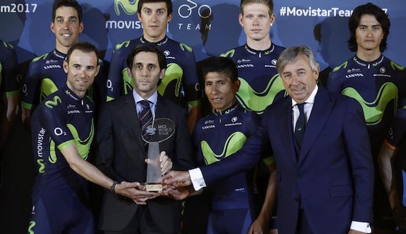 Telefónica ha presentado en el Auditorio del Edficio Central de Distrito Telefónica la plantilla 2017 de Movistar Team, galardonado en los últimos cuatro años con el título de mejor equipo ciclista del mundo según el ránking de la Unión Ciclista Internacional. En el marco de este evento el conjunto azul entregó a José María Álvarez-Pallete el trofeo de vencedores que acredita dicho título.