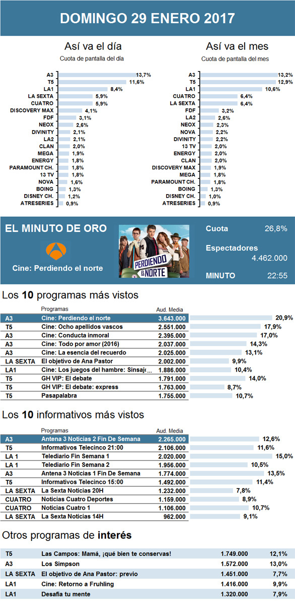 Por tercer domingo consecutivo se hizo con el completo liderazgo del día el cine de Antena 3. En esta ocasión fue gracias al estreno de Perdiendo el norte, que se mantuvo como minuto de oro y como lo más visto de la jornada, volviendo a mejorar levemente los resultados obtenidos la semana pasada por su otra cinta de estreno. Nuevamente, repitió en el segundo puesto de la noche la película elegida por La 1, Los juegos del hambre: Sinsajo - Parte 2, que en esta ocasión vio caer considerablemente sus cifras con casi medio millón de espectadores menos que semanas anteriores. Así, logró recortar distancias la tercera opción nocturna, el debate de GH VIP en Telecinco que, pese a igualar su seguimiento del domingo pasado, sí logró un leve ascenso en su cuota de pantalla. En esta ocasión La Sexta se impuso a Cuatro. Gracias a una considerable mejora por parte de El objetivo de Ana Pastor, el canal verde dejó muy por detrás a su rival que, con una nueva entrega del programa Chester in Love, sufrió una sutil caída en su seguimiento. El cine de La 2, con Una pistola en cada mano, también notó un muy leve descenso en sus espectadores. Nuevamente, durante la noche, destacaron los buenos resultados obtenidos por la cadena de pago Movistar Partidazo con el encuentro de Liga Española entre el Real Madrid y la Real Sociedad, que superó los 1,2 millones de aficionados. Cabe destacar cómo, durante la tarde, lo más visto también fue una película española, la exitosa Ocho apellidos vascos, que reunió a casi 2,6 millones de seguidores en Telecinco. Y durante la sobremesa, destacó el Open de Australia con la final entre Nadal y Federer ante 1,3 millones de aficionados en la cadena DMax, junto con los 1,4 millones que vieron su espacio posterior.