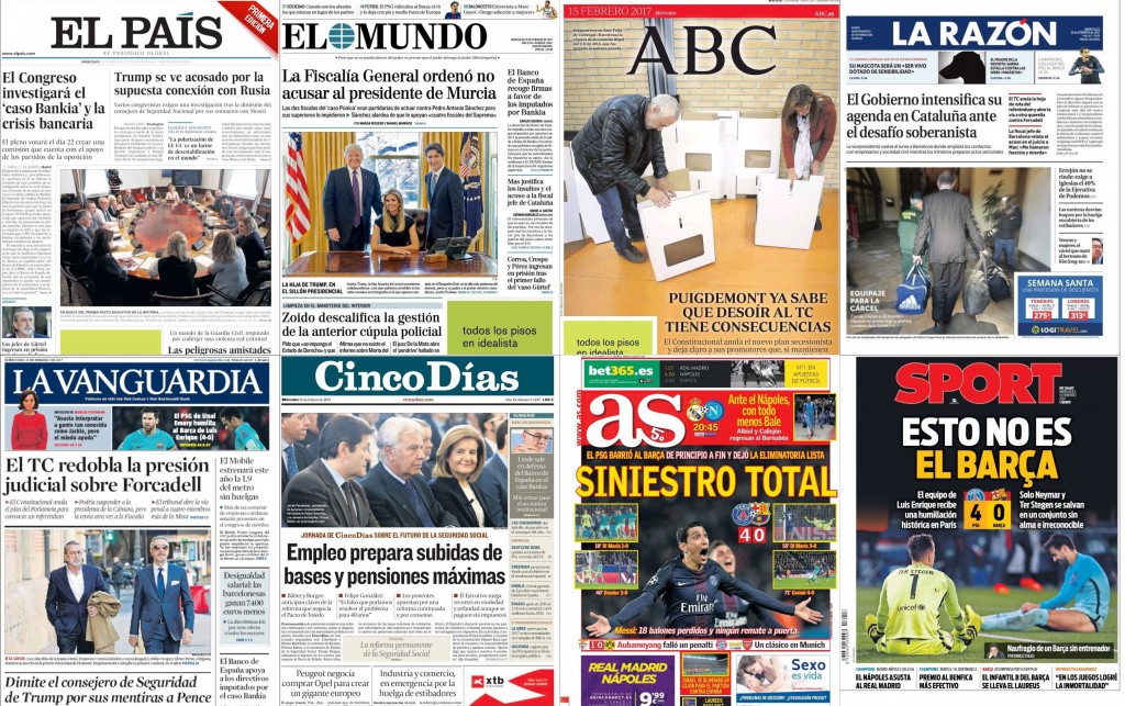 El País asegura que “El Congreso investigará el ‘caso Bankia’ y la crisis bancaria”. Además, “Trump se ve acosado por la supuesta conexión con Rusia”, mientras Federica Mogherini, jefa de la diplomacia europea, que afirma que “la polarización de EEUU es un factor de desestabilización en el mundo”. En la foto, una mesa del Congreso, “en busca del primer pacto educativo de la historia”.