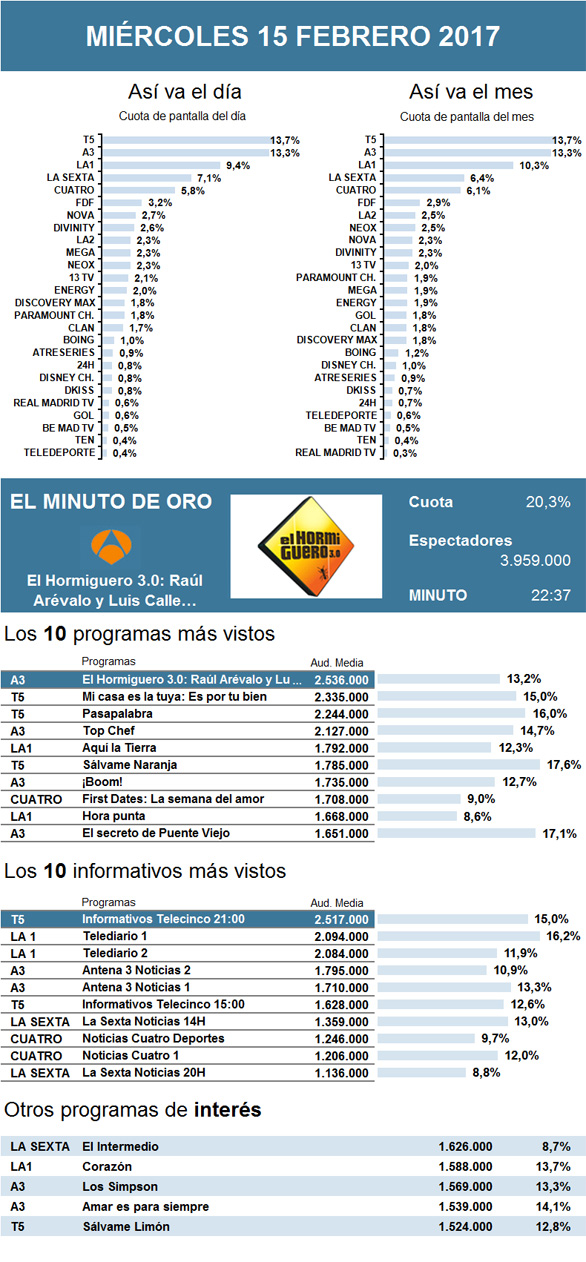 Este miércoles, Antena 3 le arrebató el liderazgo a Telecinco. La visita de Raúl Arévalo y Luis Callejo, director y protagonista respectivamente de la premiada Tarde para la ira, hizo que el programa de Pablo Motos, El Hormiguero 3.0, se alzase como minuto de oro y como lo más visto del día. Sin embargo, durante el horario estelar se mantuvo en cabeza Mi casa es la tuya, de Telecinco, con un leve descenso en relación con sus cifras de la semana pasada. Dicha bajada se debió a los buenos datos obtenidos por el estreno de la cuarta edición de Top Chef en Antena 3, que se coló en el segundo puesto de la noche, a poca distancia de su rival. Como tercera opción quedó El final del camino, de La 1, con una nueva caída hasta sus peores registros de la temporada: un 7,1 por ciento de cuota y menos de 1,2 millones de fieles. Por detrás, quedaron muy reñidas Cuatro y La Sexta, pues ambas rondaron el millón de seguidores. Esto supuso una ligera caída para el reportaje de Volando voy en el canal rojo y una sutil mejora del programa Tú sí que sí, de la cadena verde. El cine de La 2 repitió cifras con El corazón del bosque, que no varió apenas sus registros de hace una semana. En la misma franja horaria cabe destacar cómo el fútbol volvió a lograr excelentes datos en el canal de pago BeIN que, gracias al encuentro de Champions entre el Real Madrid y el Nápoles, reunió frente al televisor a 1,8 millones de aficionados.