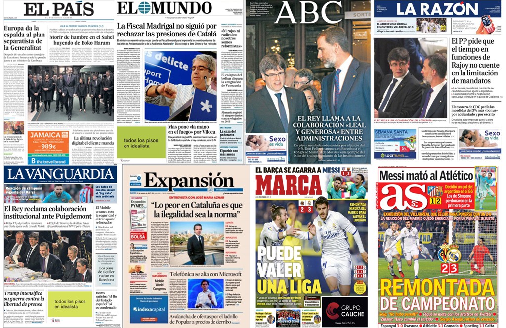 El País titula que “Europa da la espalda al plan separatista de la Generalitat”. Asegura que después de un año como sonsejero de Exteriores, Romeva solo ha posado junto a un ministro de Camboya”. En la fotografía, el Rey, que pide una colaboración “leal y generosa” en el Mobile World Congress, junto a Ada Colau, Pugidemont y Sáenz de Santamaría, entre otros. Además, Telefónica. Titula el diario que la última revolución digital consiste en que el cliente manda.