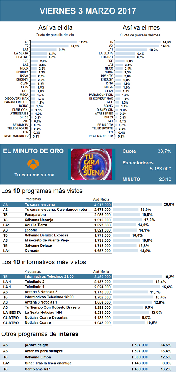 La final logró el segundo mejor dato de espectadores de la historia del programa, que en su quinta temporada ha marcado su mejor cuota de pantalla, con un 23,6% de media en las 18 galas emitidas, lo que lo ha convertido en lo más visto de la noche de los viernes.