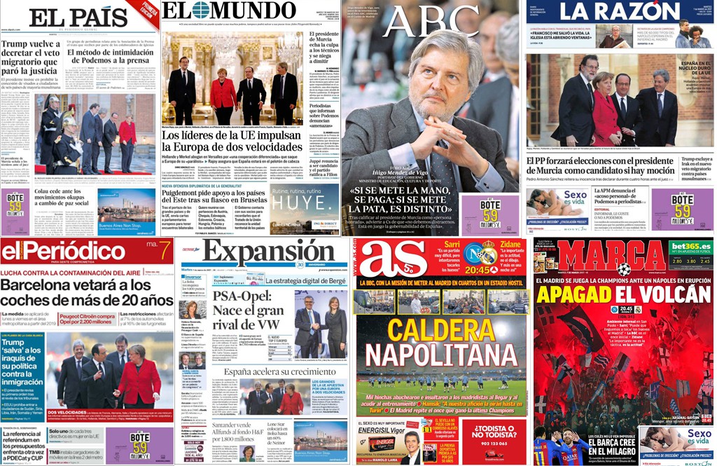 El País también con imagen de la cumbre a cuatro en el palacio de Versalles bajo el siguiente título: “El núcleo duro plantea una Europa a varias velocidades”. Además: “Trump vuelve a decretar el veto migratorio que paró la justicia”, a partir del 16 de marzo y durante 90 días no se concederán visados a ciudadanos de seis países de mayoría musulmana; “El presidente de Murcia señala a los técnicos ante el juez” ante los posibles “errores administrativos” en el caso Auditorio y la ratificación del propio diario ante el método intimidatorio empleado por Podemos a la prensa, al formar parte de los medios que reciben dichas amenazas.
