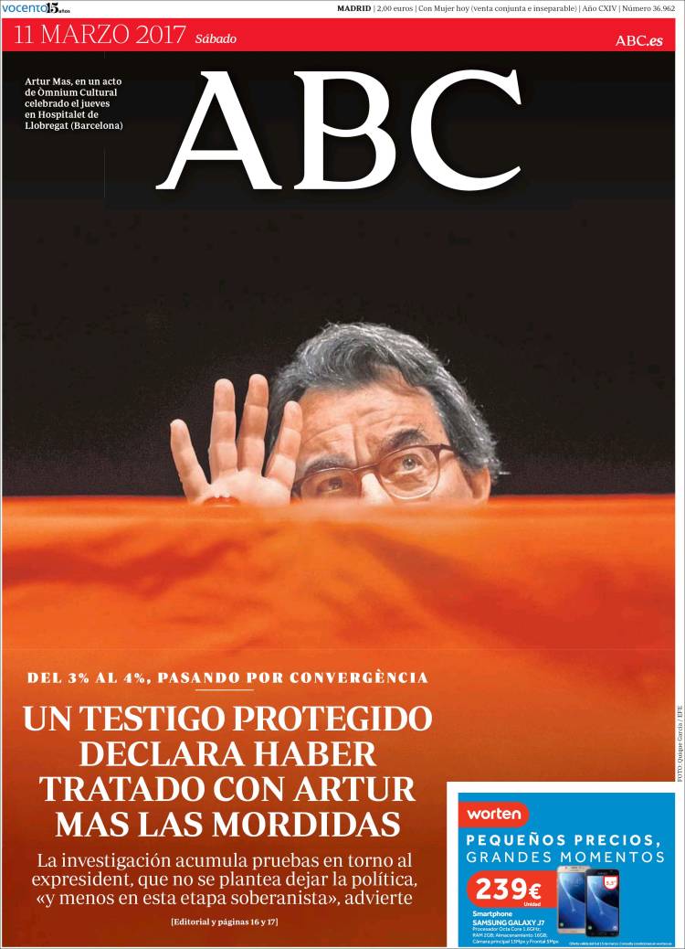 ABC se decanta por la trama del 3 por ciento en Cataluña para afirmar que un testigo protegido "declara haber tratado con Artur Mas las mordidas".