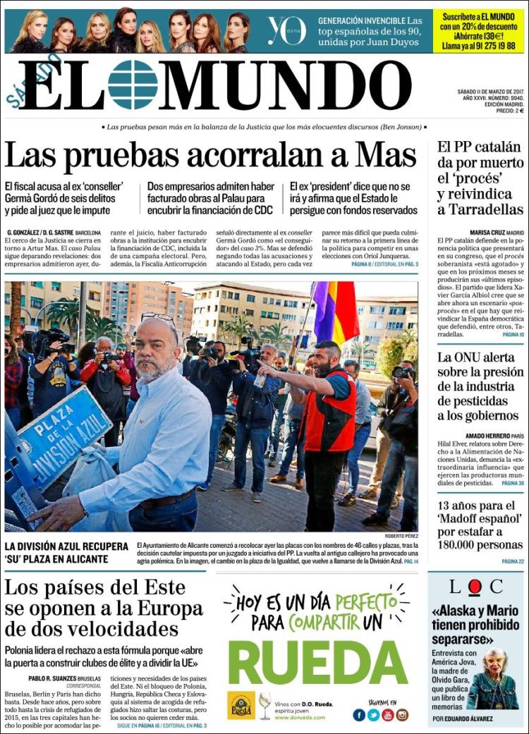 Según El Mundo, "las pruebas acorralan a Mas", a lo que añade que el expresidente catalán afirma que el Estado "le persigue con fondos reservados".
