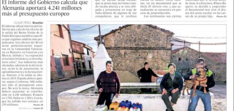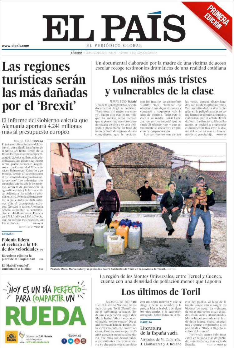 El País abre este sábado con que las regiones turísticas "serán las más dañadas por el brexit". La foto destacada de portada está dedicada a los habitantes de la región de los Montes Universales, entre Teruel y Cuenca, a quienes compara con los habitantes de Laponia.