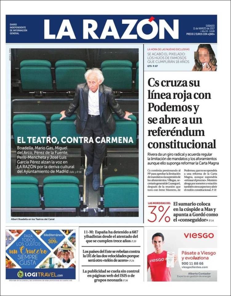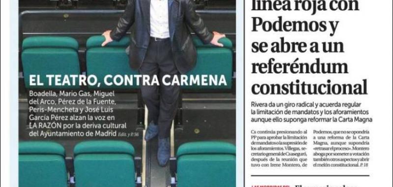 La "deriva cultural" del Ayuntamiento de Madrid, opina La Razón en portada, es tema destacado de su primera página de este sábado, protagonizada por Albert Boadella, uno de las personalidades culturales que "alzan la voz" en este periódico para quejarse de la gestión de Manuela Carmena. Además, informa de que Ciudadanos "cruza su línea roja con Podemos y se abre a un referéndum constitucional".