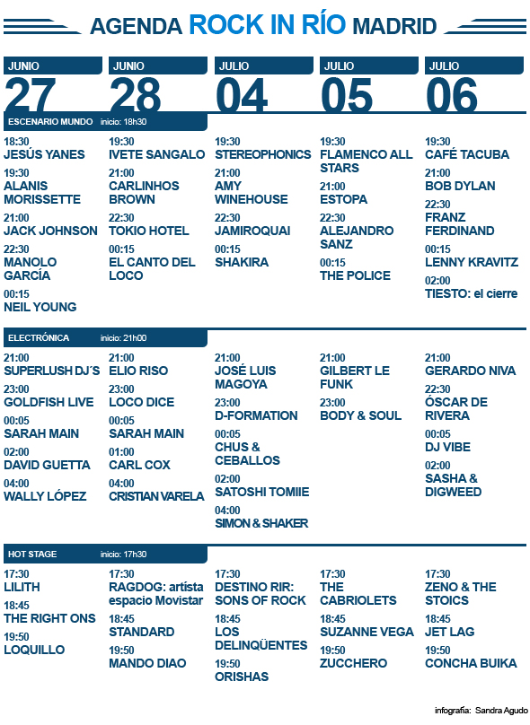 Grandes del rock junto a figuras emergentesLa programación del Rock in Río Madrid ha seguido el criterio de combinar grandes glorias del rock de siempre (Neil Young, Bob Dylan, The Police) con grupos emergentes o de breve pero exitosa trayectoria, con gran tirón entre los jóvenes. En este último bloque se encuentran El Canto del Loco, Tokio Hotel o la polémica Amy Winehouse, cuya aparición en escena no cuenta con muchas garantías pese a figurar aún en cartel. Le han diagnosticado un enfisema pulmonar y los médicos le han recomendado suspender su agenda.