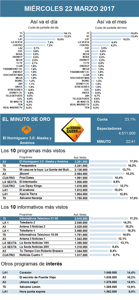 Este miércoles, El Hormiguero 3.0, de Antena 3, consiguió hacerse con el completo liderazgo del día. El espacio presentado por Pablo Motos se coronó por tercera semana consecutiva como minuto de oro. Además, en esta ocasión, se alzó como el programa más visto de la jornada con medio millón de interesados más que la semana pasada, gracias a la visita de la cantante Alaska y de su madre, América.