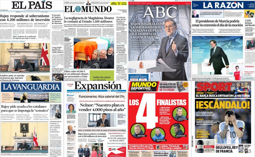 El País: “Rajoy responde al soberanismo con 4.300 millones de inversión”. También resalta que el anuncio se produce “ante medio millar de empresarios catalanes”. También habla de que Homs está “pendiente de la notificación del Supremo para dejar el escaño”. En la imagen, Theresa May firma la carta a la presidencia europea para activar la salida de Reino Unid ode la UE: “Londres pone en marcha el proceso que marcará el futuro de Europa”, mientras que “Escocia aprueba negociar otro referéndum”, dice este rotativo.