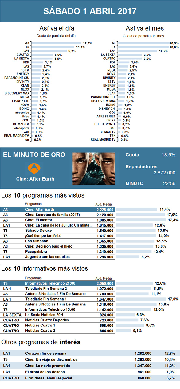 Este sábado, Antena 3 se hizo con el completo liderazgo del día gracias a After Earth. La película protagonizada por Will Smith y por su hijo Jaden, además de mantenerse en lo más alto de las listas como lo más visto de la jornada, también logró arrebatar el minuto de oro a Pasapalabra. La cinta nocturna reunió a casi medio millón más de curiosos que el cine de tarde con el que la cadena acaparó el podio hace siete días.
