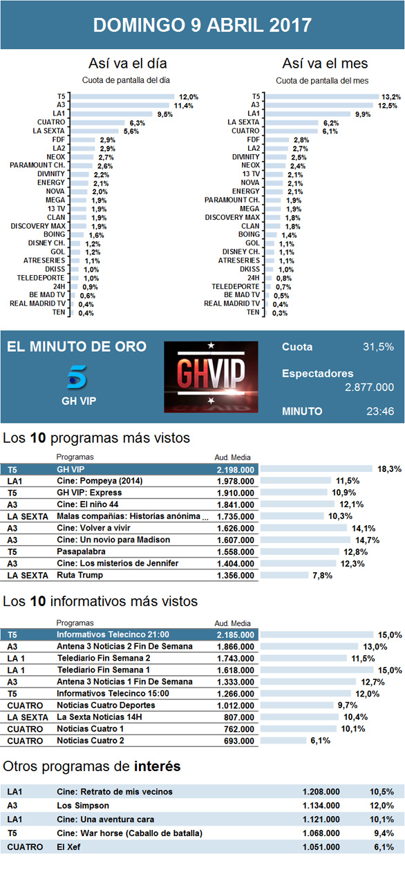 Telecinco acertó al dividir en dos la final de GH VIP. Este domingo, su primera parte logró hacerse con el completo liderazgo del día, además de mejorar en casi medio millón el número de seguidores que obtuvo hace una semana con su debate. De este modo, le arrebató tanto el minuto de oro como el puesto de programa más visto de la jornada al cine de La 1 que, con Pompeya (2014), descendió a segunda opción de la noche con medio millón menos de interesados que la semana pasada.