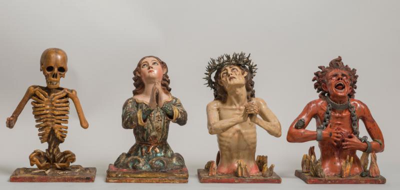 • Las Postrimerías del Hombre: La muerte; Un alma en el Infierno; Un alma en el Purgatorio, Un alma en el Cielo. Atribuido a Manuel Chili, Capiscara. Madera policromada, vidrio y metal, h. 1775. Nueva York, The Hispanic Society of America