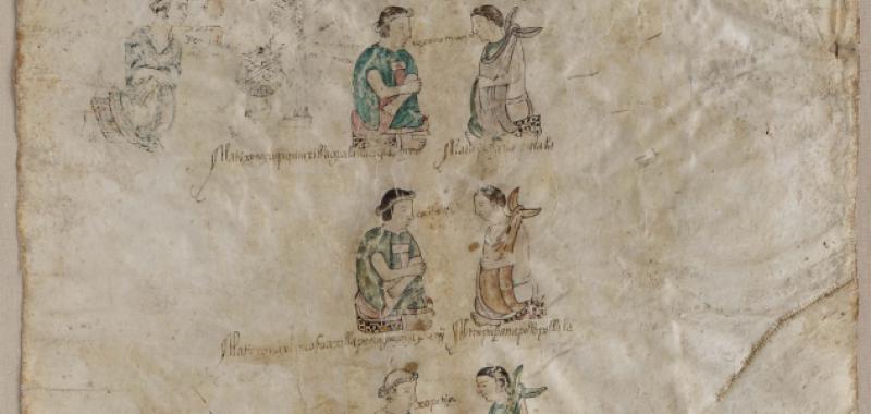 • Árbol genealógico de Macuilxochitl. Manuscrito ilustrado sobre pergamino. San Mateo de Macuilxochitl, Oaxaca, México, h. 1570 Nueva York, The Hispanic Society of America