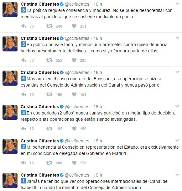 La presidenta de la Comunidad de Madrid ha negado, por su parte, que haya participado como consejera del Canal Isabel II en "ningún tipo de decisión, respecto a las operaciones que están siendo investigadas". Así se ha pronunciado en una cadena de 'tuits' en su cuenta.
