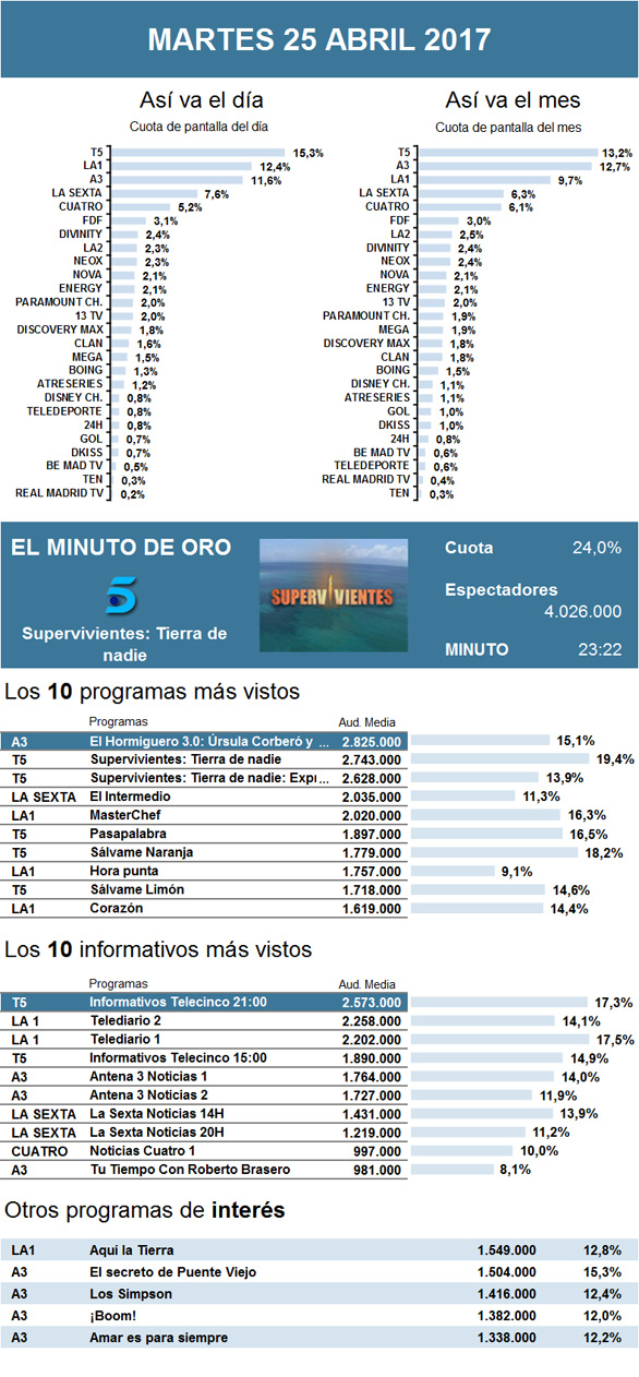 Sin fútbol y con cambios en la programación de sus rivales, Antena 3 no consiguió mantener su liderato habitual en la noche de los martes. Aunque, en esta ocasión gracias a El Hormiguero 3.0, logró mantenerse como lo más visto de la jornada por cuarta semana consecutiva, la cadena perdió el puesto de minuto de oro ante Superviviente: Tierra de nadie.