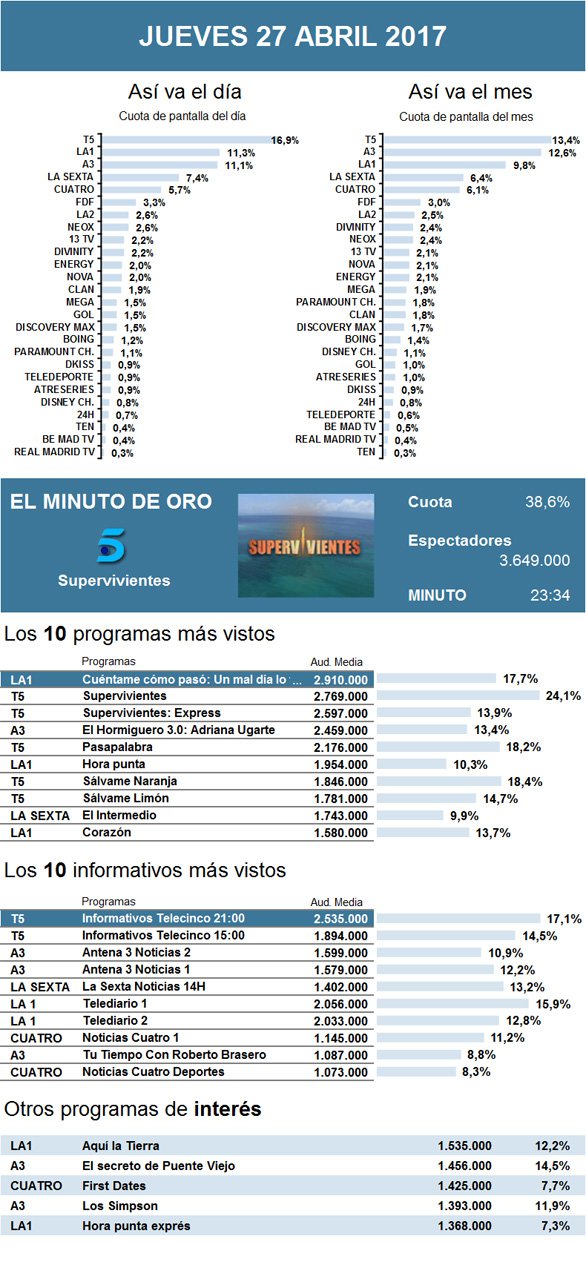 Siete días después de su tropiezo contra el estreno de Supervivientes 2017, recuperó el puesto de programa más visto del jueves Cuéntame cómo pasó, de La 1, con casi medio millón de interesados más que la semana pasada. Sin embargo, el crecimiento de la serie no fue suficiente para retomar el completo liderazgo del día, pues el 'reality' logró mantenerse como minuto de oro. Además, el concurso de supervivencia fue segunda opción de la noche al seguir de cerca a su rival sin apenas variar los datos de su estreno.