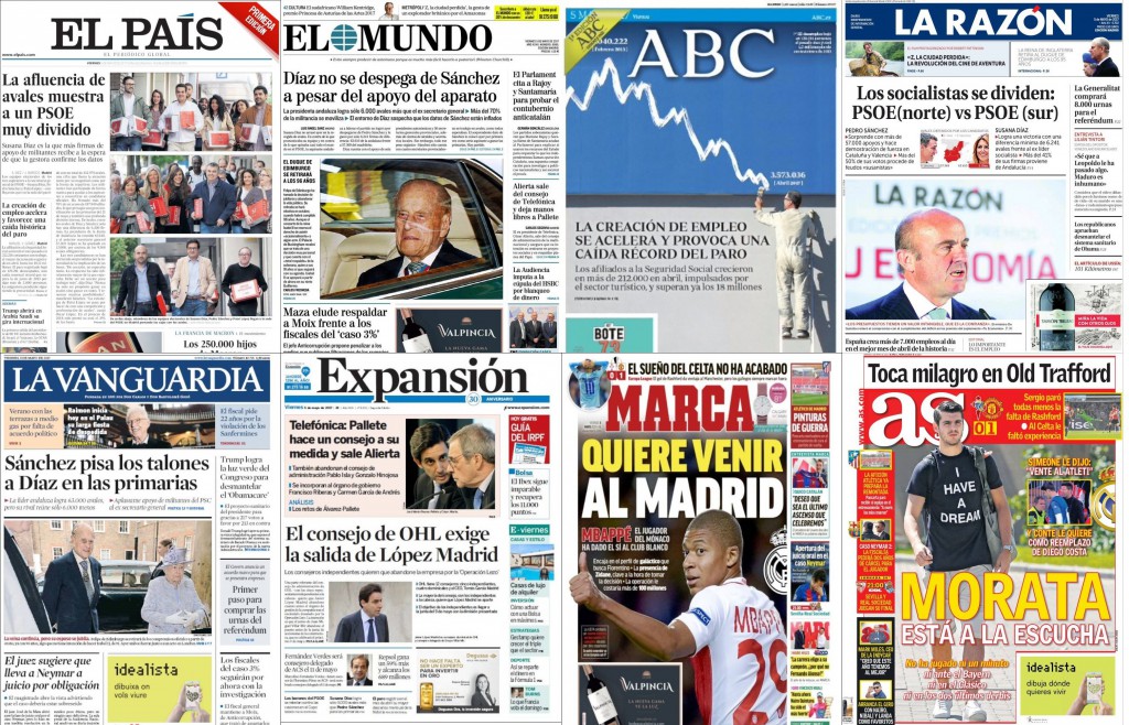 “Díaz no se despega de Sánchez a pesar del apoyo del aparato”, titula El Mundo. El diario indica el número de votos obtenidos por la presidenta andaluza, “sólo” 6.000 más que el ex secretario general e indica que el entorno de Díaz sospecha que los datos de Sánchez están inflados. El “sorprendente” dato de Sánchez lo coloca “por primera vez” como “serio aspirante”. Con foto del esposo de la reina de Inglaterra ilustra su portada y escribe: “El duque de Edimburgo se retirará a los 96 años”. Otras noticias destacadas: “El Parlament cita a Rajoy y Santamaría para probar el contubernio anticatalán”; “Alierta sale del consejo de Telefónica y deja manos libres a Pallete”; “La Audiencia imputa a la cúpula del HSBC por blanqueo de dinero” y “Maza elude respaldar a Moix frente a los fiscales del ‘caso 3%’”.