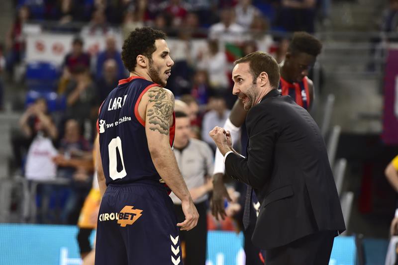 Kyle Kuric apareció para sacar a flote a los suyos en los primeros minutos del segundo cuarto. Sus cinco puntos consecutivos frenaron la sangría y la situación en una desventaja de 12 puntos. Entonces Larkin reaccionó, acompañado por Shengeila, para recobrar la desequilibrada relación de fuerzas. Dominaba el ritmo acelerado local y los amarillos trataban de anestesiarlo. Su presión a toda cancha sí alcanzaría a empantanar a los vascos, llegando al descanso con un 34-28 rematado por un mate de O´Neale.