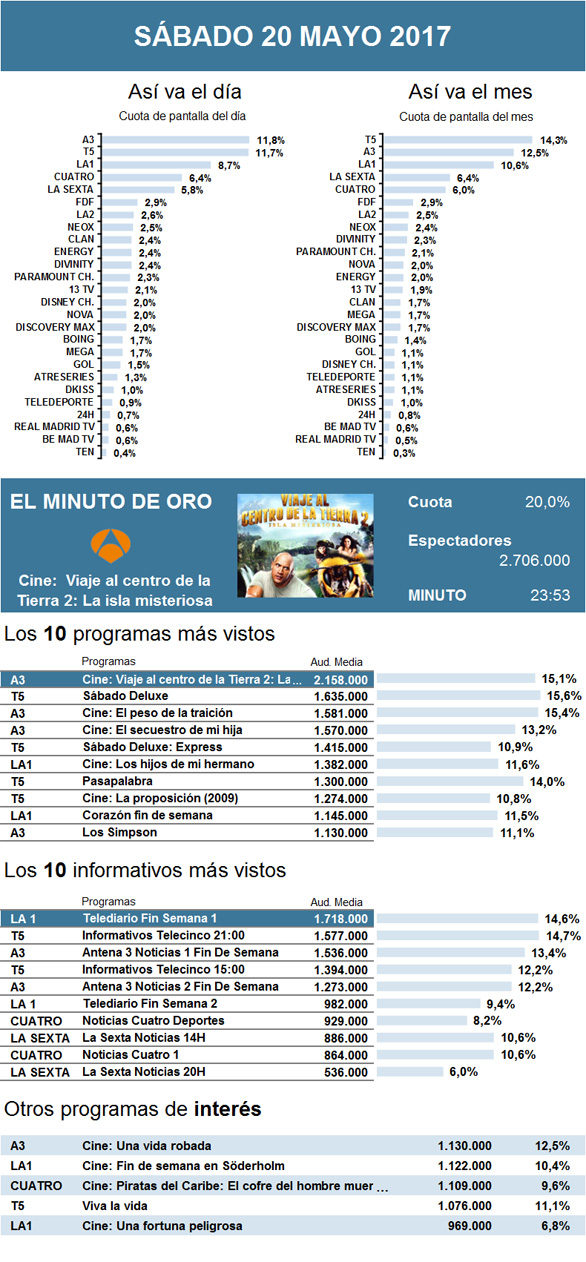 Una semana después de la victoria televisiva del Festival Eurovisión 2017 en La 1, este sábado Antena 3 recuperó por completo el liderazgo del día. Acaparó el minuto de oro y fue lo más visto de la jornada gracias al triunfo de su película nocturna, Viaje al centro de la Tierra 2: La isla misteriosa, protagonizada por Dwayne 'The Rock' Johnson, que atrajo a un millón de interesados más que la cinta de la semana pasada, además de mejorar levemente a la de hace dos.