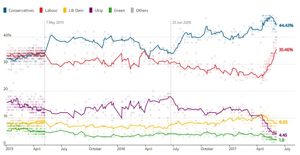 Hace escasas cinco semanas, The Times calificaba de "insalvable" la distancia de 20 puntos entre el candidato laborista Jeremy Corbyn, que cuentan a día de hoy con un respaldo del 39 por ciento, y la actual primera ministra británica y favorita entonces, Theresa May, con una intención de voto que ronda el 42 por ciento.