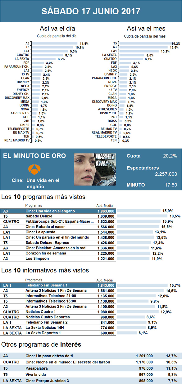 Este sábado logró hacerse con el completo liderazgo del día Antena 3 con su película de sobremesa. El telefilme Una vida en el engaño consiguió conquistar el minuto de oro y mantenerse como lo más visto del día gracias a un leve ascenso en comparación con sus cifras de la semana pasada.