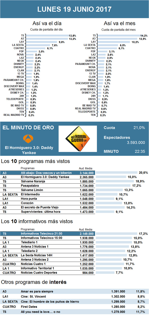 Tras cumplir su tercer mes consecutivo de liderato en la noche de los lunes, Antena 3 continuó conservando el completo control nocturno. Para no variar, El Hormiguero 3.0 se coronó como minuto de oro con la visita del polifacético cantante puertorriqueño Daddy Yankee. Sin embargo, una vez más, Allí abajo se alzó como lo más visto de la jornada, con una sutil mejoría en relación con sus registros de hace una semana.