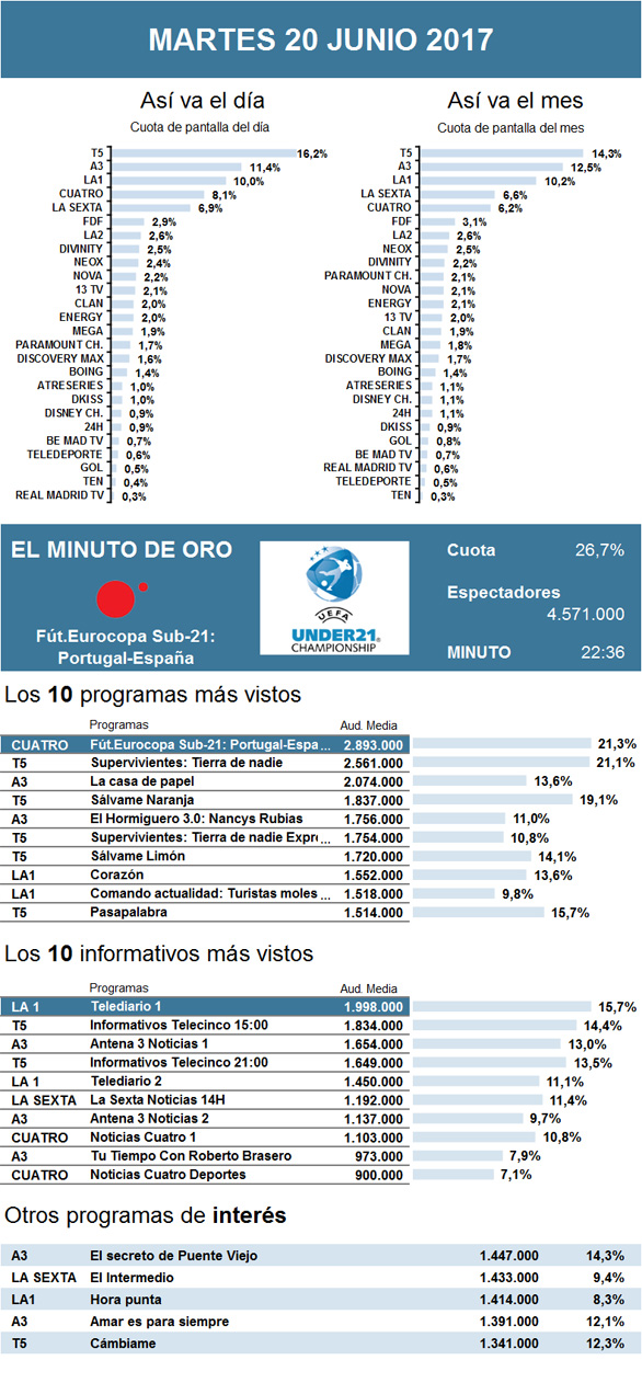 Este martes no tuvo rival televisivo el encuentro de Eurocopa Sub-21, retransmitido por Cuatro, que se hizo con el completo liderazgo gracias a la victoria de España frente a Portugal. El partido no sólo se alzó como minuto de oro, sino que también fue lo más visto de la jornada. A continuación, durante el horario estelar, volvió a sobresalir Supervivientes, de Telecinco, que siguió mejorando sutilmente sus cifras anteriores.