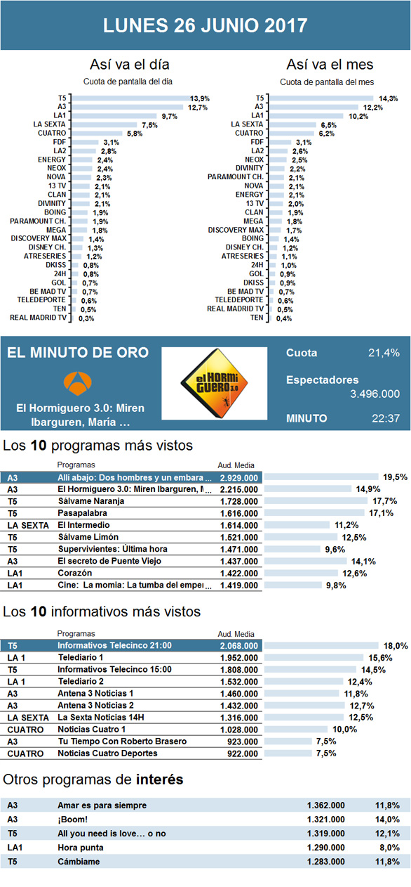 Se cumplen tres meses y medio de consecutivo liderazgo de Antena 3 en la noche de los lunes. Una vez más, El Hormiguero 3.0 se coronó como minuto de oro con la visita de los actores españoles Miren Ibarguren, María Castro y Daniel Guzmán. Sin embargo, Allí abajo fue nuevamente lo más visto de la jornada, con un leve tropiezo en relación con sus cifras de la semana pasada.