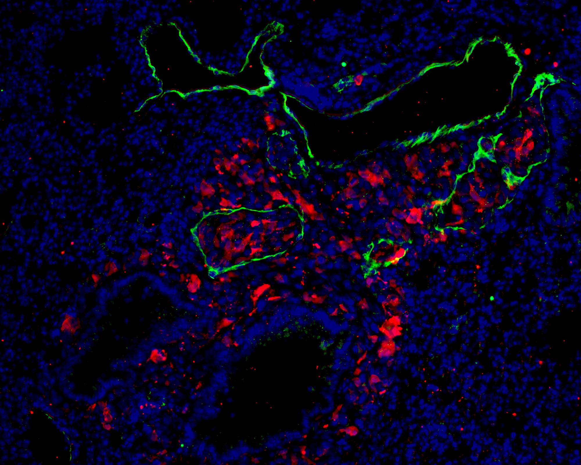 Células de melanoma metastásico (rojo) en vasos linfáticos en pulmón (verde) (Foto: CNIO)