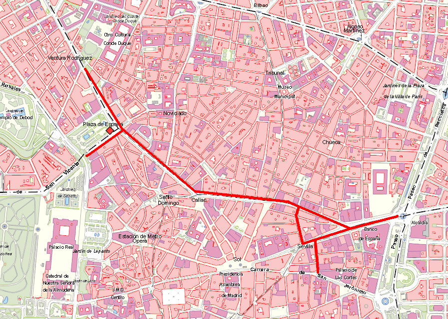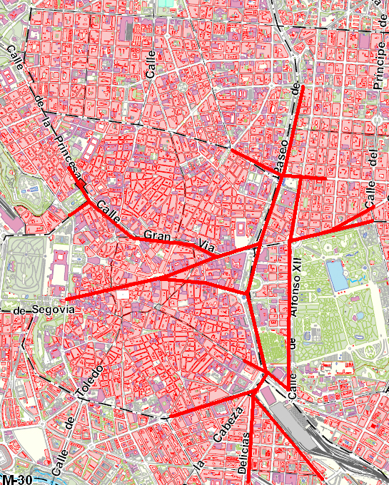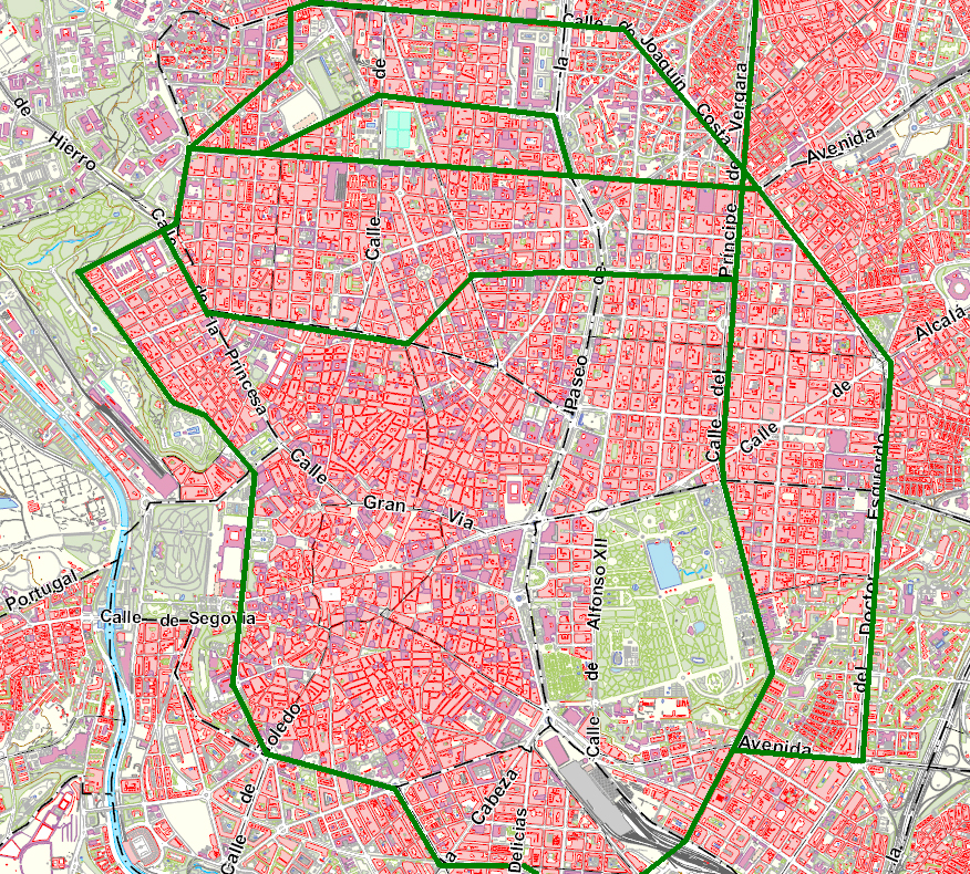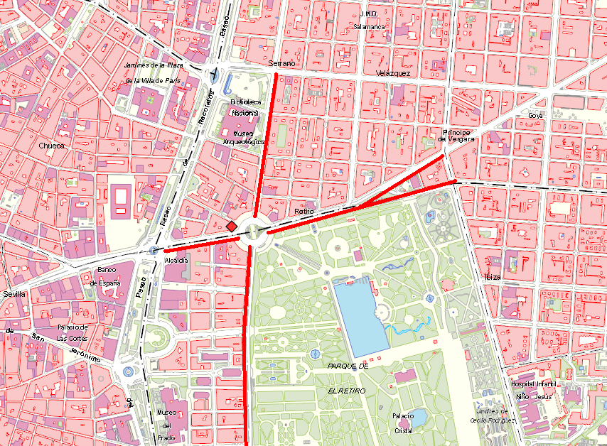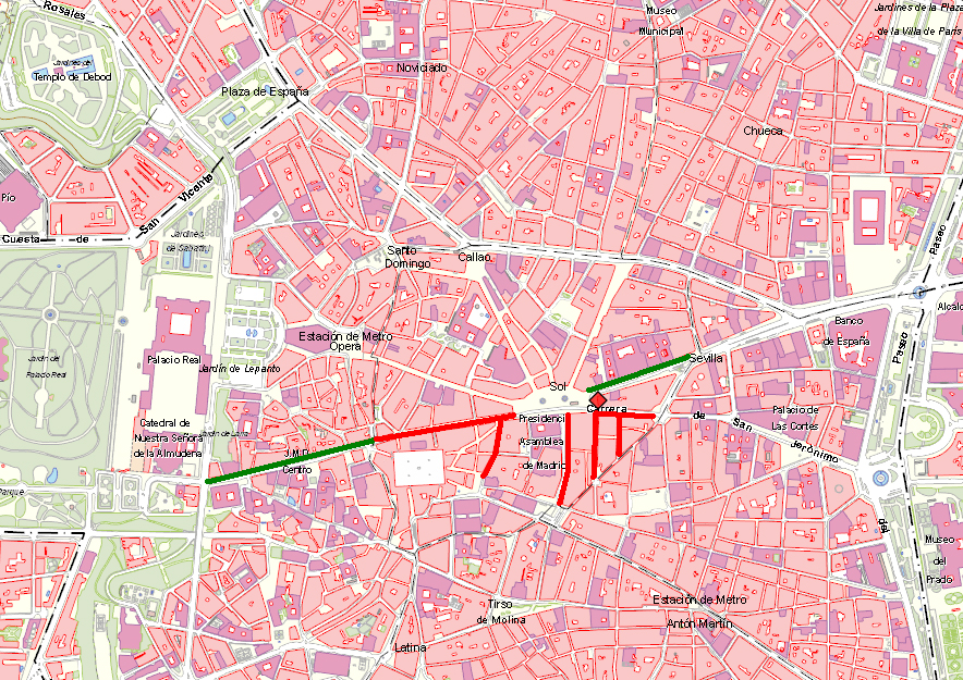 El Ayuntamiento de Madrid ha proporcionado en su página web siete planos distintos con los cortes y rutas alternativas para favorecer la movilidad estos días. En rojo aparecen las calles cortadas y el trazado en verde es el itinerario recomendado para esquivarlas: