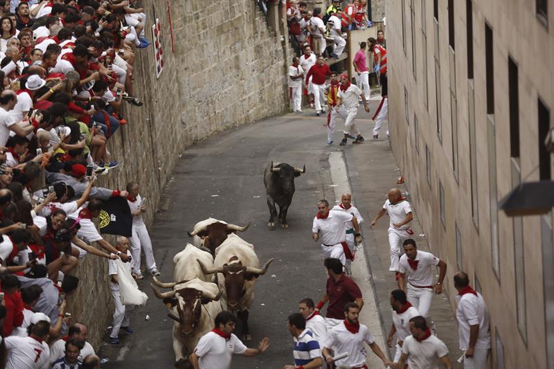 El segundo encierro de los Sanfermines, con toros de la ganadería de José Escolar, ha estado protagonizado por su duración - algo más de 4 minutos - y un toro rezagado que ha vuelto al corral en la cuesta de Santo Domingo.