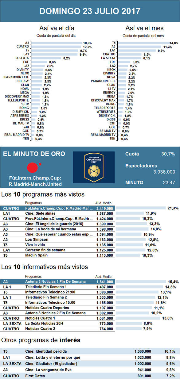 Este domingo Cuatro se hizo con el completo liderazgo de la noche. Fue gracias al encuentro de la International Champions Cup, que se coronó minuto de oro y fue lo más visto del día con el partido entre el Real Madrid y el Manchester United. Aunque comenzó una hora antes que el fútbol, la película de La 1, Siete Almas, se mantuvo como segunda opción de la noche con una débil mejoría en comparación con la semana anterior. Conservó el tercer puesto el cine de Antena 3 con Qué esperar cuando estás esperando, que también vio aumentar levemente su audiencia.